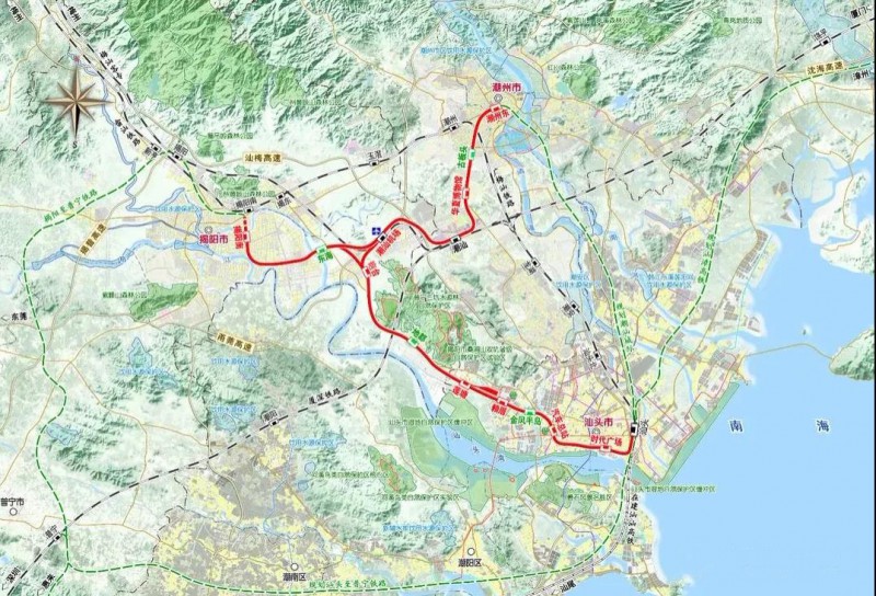汕头至潮汕机场段:项目位于汕头市和揭阳市境内,线路全长45.278km,设车站8座,其中揭阳市境内21.18km;