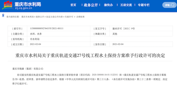 记者了解到,目前,27号线工程水土保持方案准予行政许可的决定已由重庆市水利局发布。