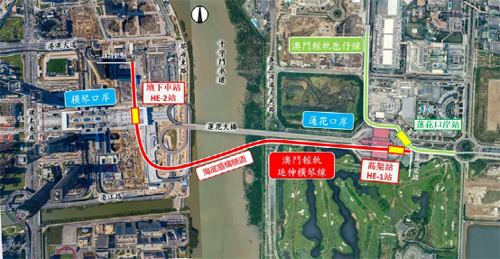 澳门轻轨横琴线主体建筑由高架桥、河底隧道及两个车站组成,线路全长约2.2公里,其中隧道段约900米。车站分别位于目前澳门轻轨氹仔线莲花大桥站旁的“HE1站”,以及位于横琴口岸地库下层的“HE2站”。线路以高架方式始于“HE1站”,沿莲花大桥方向自高架逐渐下降,以河底隧道方式穿过十字门水道进入珠海横琴,终点为横琴口岸的“HE2站”。