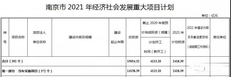 南京市政府日前印发《南京市2021年经济社会发展重大项目计划》。2021年,全市将安排重大项目392个,总投资15054.32亿元,2021年计划投资2418.39亿元。