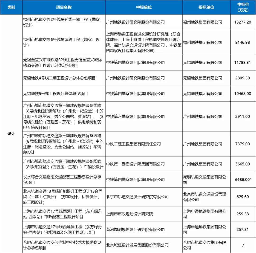 2月城市轨道交通设计类共11条中标信息,总额达到70277.57万元。