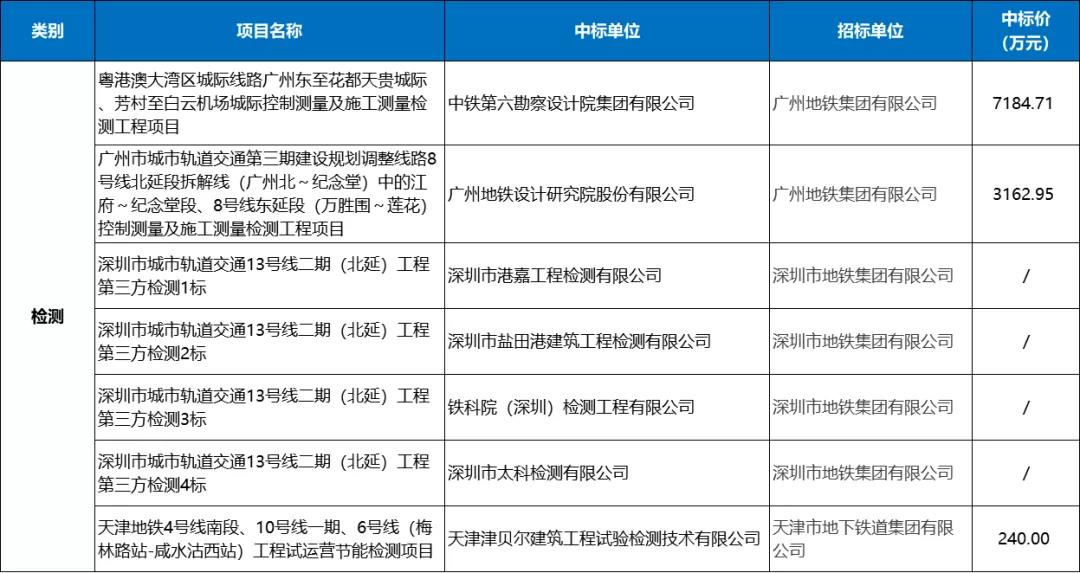 2月城市轨道交通服检测类有7条中标信息,总额超过10587.66万元。