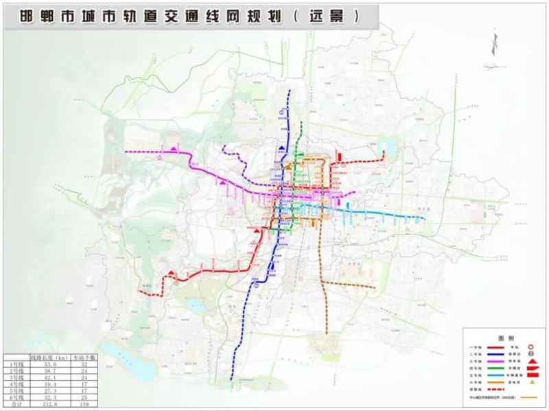 《邯郸市城市轨道交通线网规划》共包含6条线路,分别为1-6号线,总长213.3km,共设车站137座。