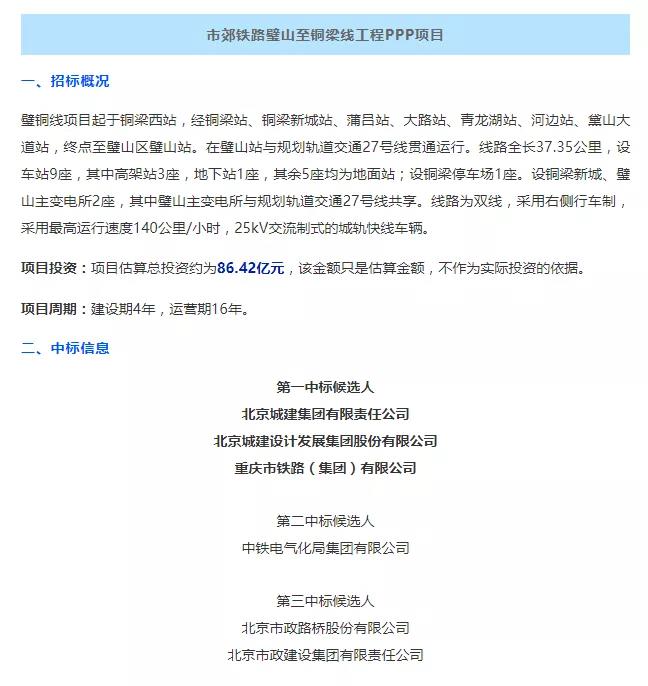 重庆市郊铁路璧山至铜梁线工程PPP项目于2月份发布中标 ,中标单位是由北京城建集团有限责任公司、北京城建设计发展集团股份有限公司以及重庆市铁路(集团)有限公司组成的联合体。