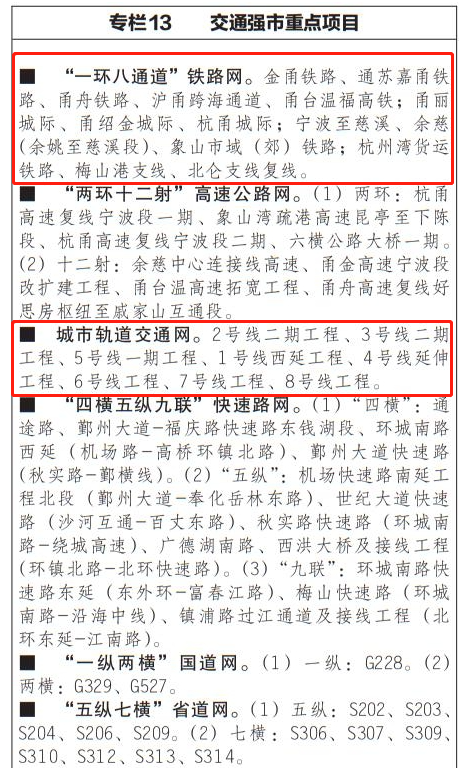 3月4日,宁波市人民政府发布《宁波市国民经济和社会发展第十四个五年规划和二〇三五年远景目标纲要》。在专栏13中,提出了“交通强市重点项目”。