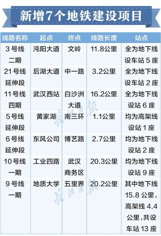 武汉轨道交通第四期建设规划调整包含7个项目,新增9号线一期、10号线一期、11号线四期、3号线二期调整、5号线延伸段、6号线延伸段、21号线延伸段。