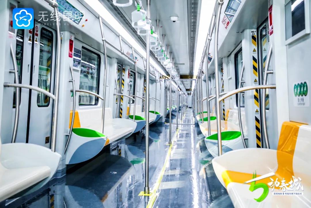 据昆明地铁5号线车辆总体设计师陈正介绍,列车采用B型车,6节编组,最高运行速度80km/h,最大载客量2094人,不仅富有鲜明的昆明特色,而且具有节能环保、安全可靠、体验舒适等特点。