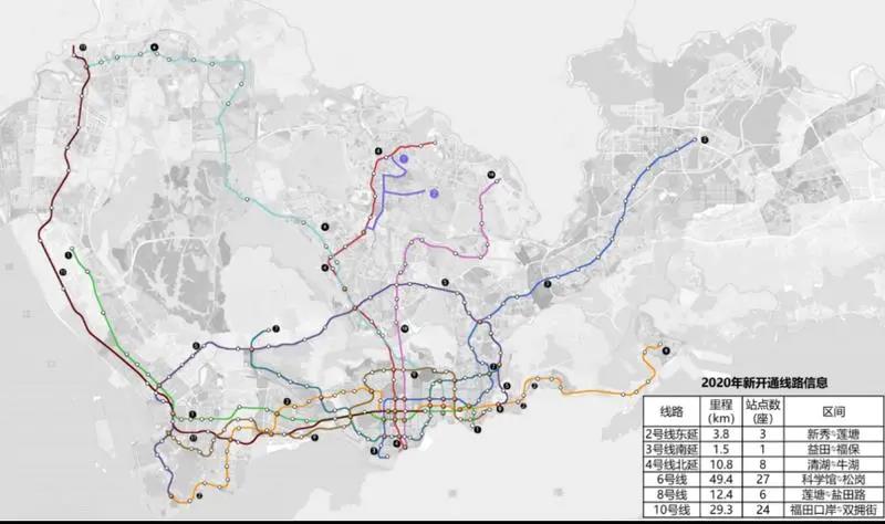 2020年深圳市共开通6条合计108公里地铁线路,轨道交通线网(包含有轨电车)运营里程跨越400公里大关,达到422.4公里,运营站点增至254座。2020年是继2016年地铁7、9、11号线开通之后,开通线路里程最多的一年。新线的开通,结束了光明、盐田、福保、观澜等多个片区“无地铁”的历史,进一步提升全市轨道交通线网的服务范围及乘客出行的便捷性,有效缓解了关键断面高峰时段的通勤客流压力。