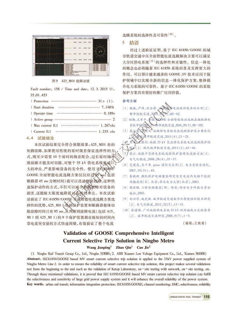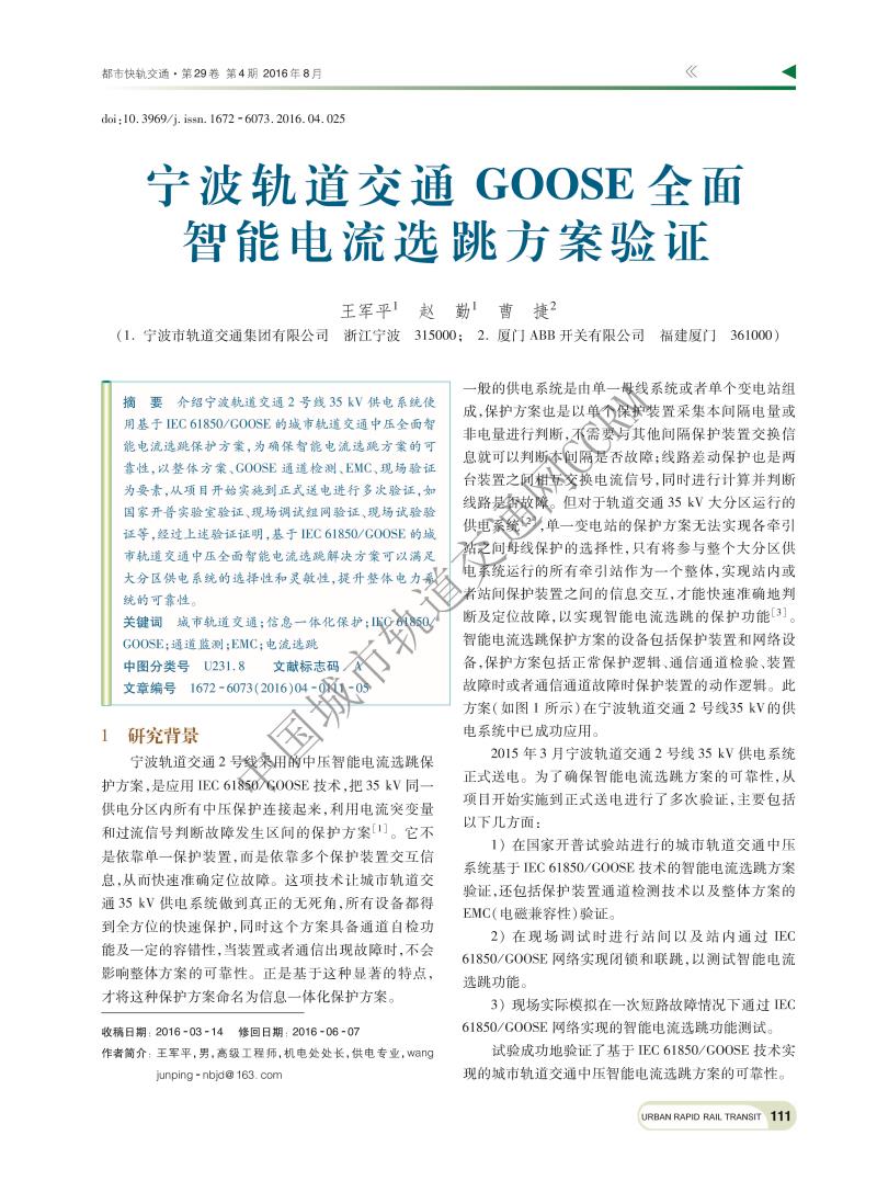 宁波轨道交通GOOSE全面智能电流选跳方案验证