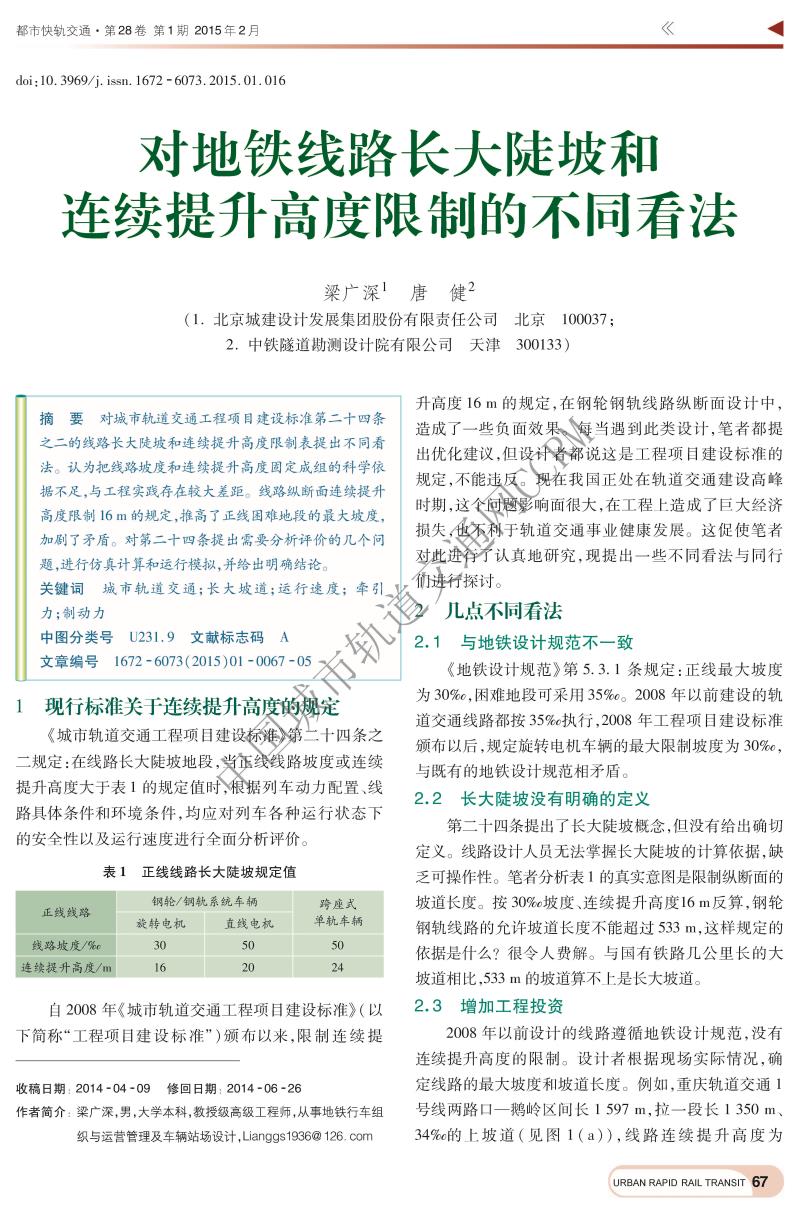 对地铁线路长大陡坡和连续提升高度限制的不同看法
