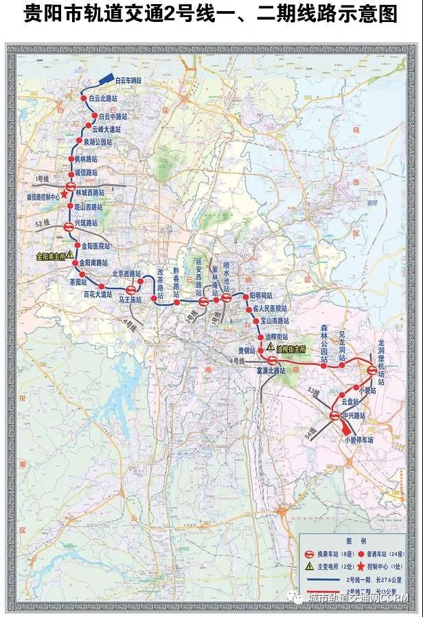 贵阳轨道交通2号线一期和二期全长40.6公里,设车站32座,其中地下站30座,高架站2座,最大站间距3206米(富源北路站~森林公园站),最小站间距634米(紫林庵站~喷水池站)。设1个车辆段、1个停车场、2座主变电所,控制中心与1号线共用。其中,2号线一期工程从白云北路站至油榨街站,线路全长27.6公里,共24个车站;2号线二期工程从油榨街站至中兴路站,线路全长13公里,共8个车站。