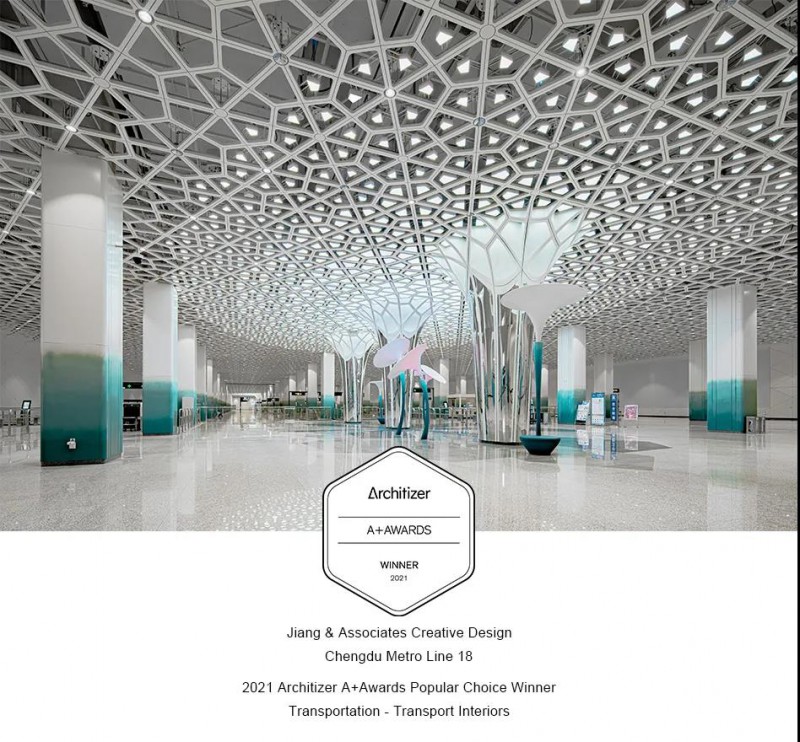 成都轨道交通18号线在A+Awards 40多万人次的投票中脱颖而出,成全球范围内交通类别唯一获奖的中国作品,荣获“2021年度交通空间类别公众选择奖(2021 Architizer A+Awards Popular Choice Winner, Transportation - Transport Interiors)”。