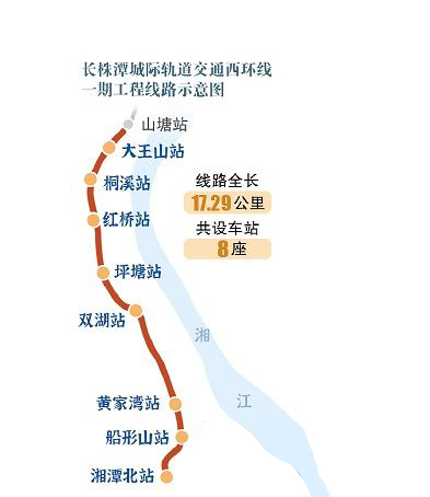 长株潭城际轨道交通西环线一期工程起于沪昆高铁湘潭北站,由南向北沿潭州大道敷设,止于长沙地铁3号线山塘站,线路全长17.29公里,共设8座车站,其中地下站4座、高架站4座。
