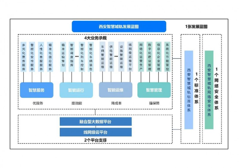 西安智慧城轨以城轨建设、运营单位的四大核心业务为导向,通过新兴信息技术的研究与应用,构建“12411”智慧城轨体系架构,打造基于先进技术赋能的轨道交通新模式。“12411”体系架构用一张西安智慧城轨发展蓝图覆盖区域内全部智慧城轨系统,以云平台、大数据平台两个平台为支撑底座,承载智慧服务、智能运行、智能运维、智慧管理四大核心业务,建立标准体系、网络安全体系,实现各业务的全息感知、互联融合、智能诊断及主动决策,提升服务水平、提高运行效率、降低运营成本、提升管理效能,形成安全、便捷、高效、绿色、经济的新一代智慧城轨体系。