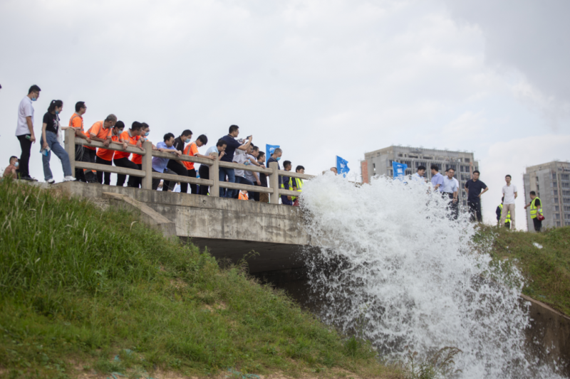 应急拉练通过现场实战形式开展,以消除6号线创智谷站~石山路站区间TBM穿越蔡家庄水库重大地质风险为背景,采用“龙吸水”子母式排水抢险车对水库库存水进行抽排。拉练开始,仅用时15分钟便完成从设备进场到每小时3000立方米额定功率运行。响应速度和排水能力得到与会专家领导的高度认可。