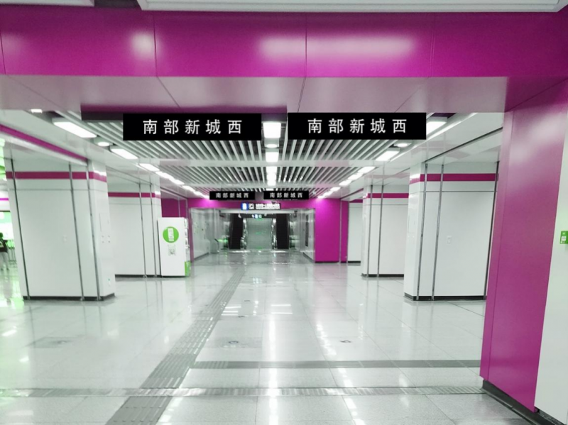 南部新城西站为地下两层岛式车站,全长238.7m。车站附属结构包括4个出入口,2组风亭及1个消防水池。