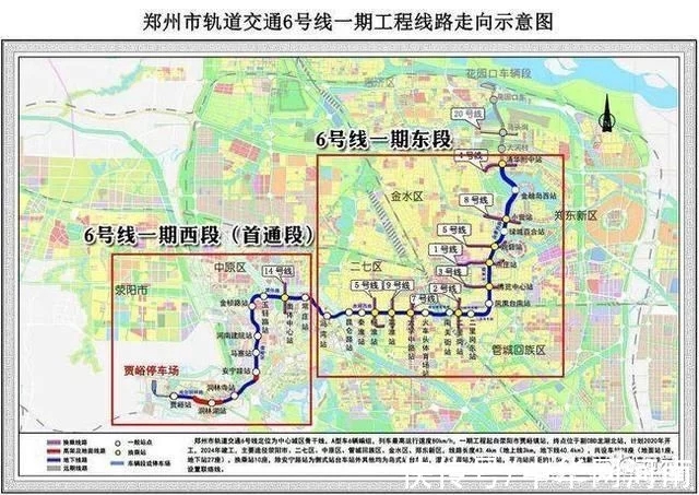 记者了解到,郑州地铁6号线一期工程线路起于荥阳市贾峪站,止于郑东新区清华附中站,沿线经二七区马寨镇,中原区市民文化服务中心,连接贯穿荥阳、中原区、二七区、管城区、郑东新区、金水区,最终到达郑东新区北龙湖附近。线路主要沿洞林路、文泽路、滨湖南路、奥莱大道、明晖路、常州路、文博大道、凯旋路、淮河路、南关南街、二里岗南街、未来路、众意西路敷设。