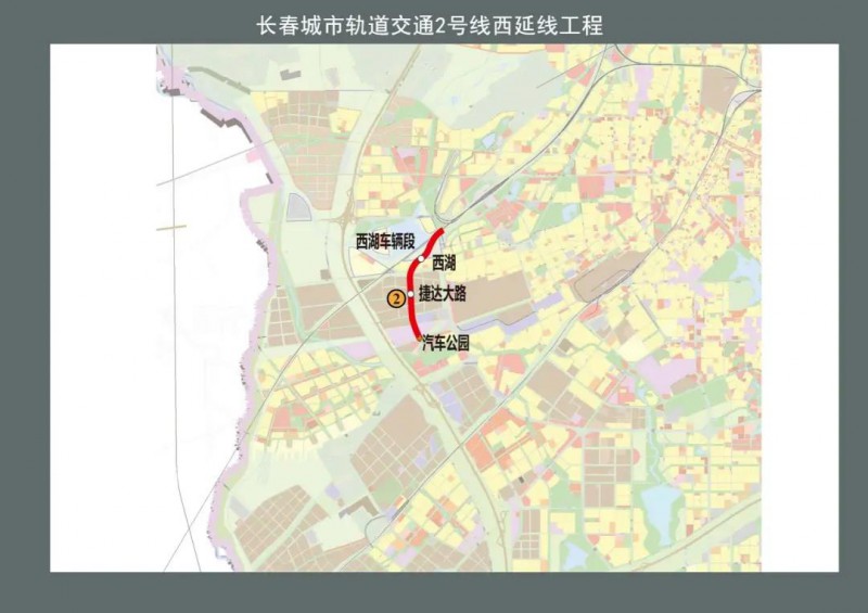 轨道交通2号线西延线工程为既有2号线一期工程的延伸工程,线路长4.4公里,连接着长春西站、西湖、汽车零配件产业区、国际汽车公园等重要的城市功能区,主要起到完善既有2号线的服务范围及换乘功能的作用,共设车站3座,均为地下站,分别为汽车公园站、捷达大路站和西湖站。