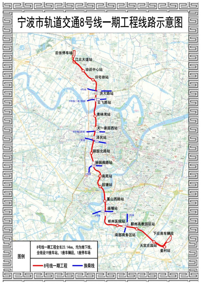 全线设站19座,平均站间距1.27公里,线路在江北洪塘设停车场1座,在鄞州下应设车辆段1座。其中——