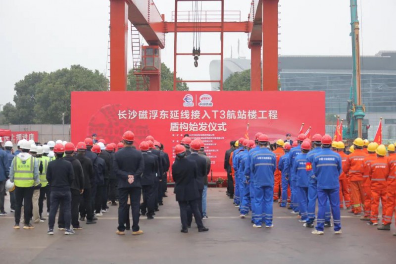 盾构始发现场,湖南机场集团党委书记、董事长姚英杰致贺词。长沙轨道集团党委副书记、总经理周晓明宣布“长沙磁浮东延线接入T3航站楼工程‘磁浮1号’盾构始发”。湖南机场集团党委副书记、总经理谭克涛,党委副书记崔武松,长沙轨道集团党委委员、副总经理蒲富华,中铁建华中区域总部执行总经理刘青林,中铁磁浮公司党委副书记、总经理谢海林,中铁十四局党委副书记、总经理周长进,纪委书记陈明,铁建重工集团纪委书记王彪,及中铁四院、中铁二院、北京城建、友谊国际咨询、湖南联智科技、中铁十六局等单位嘉宾与广大磁浮建设者共同见证世界首台中低速磁浮隧道盾构机顺利始发。