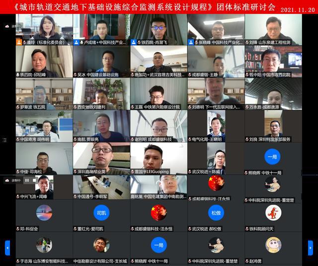 2021年11月20日,由中国科技产业化促进会组织、中铁第四勘察设计院集团有限公司(以下简称铁四院)牵头起草的《城市轨道交通地下基础设施综合监测系统设计规程》(以下简称《规程》)团体标准研讨会通过线上会议的形式召开。