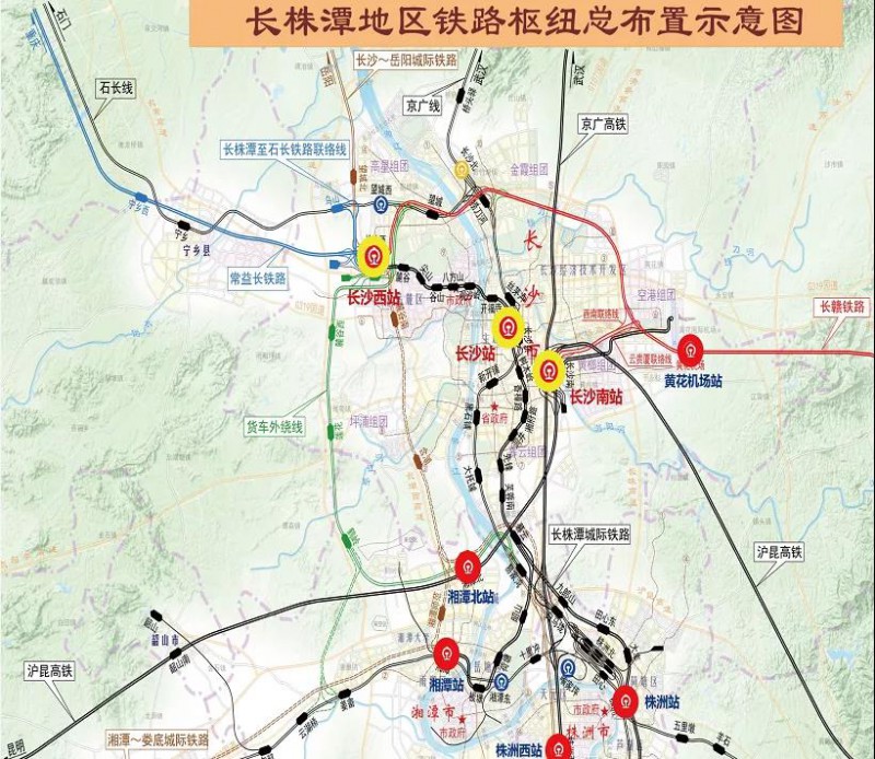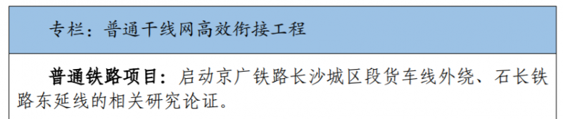 优化普速铁路网布局,统筹考虑城市空间发展格局,减小货物运输对城市环境的影响,启动京广铁路长沙城区段货车线外绕、石长铁路东延线等项目的研究论证,构建市域铁路货运大通道。