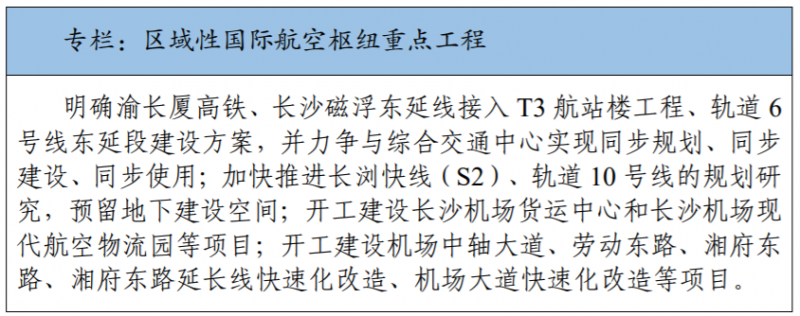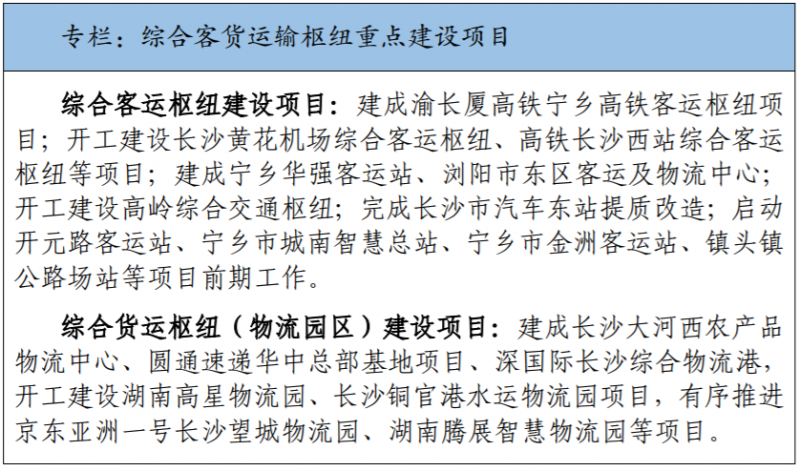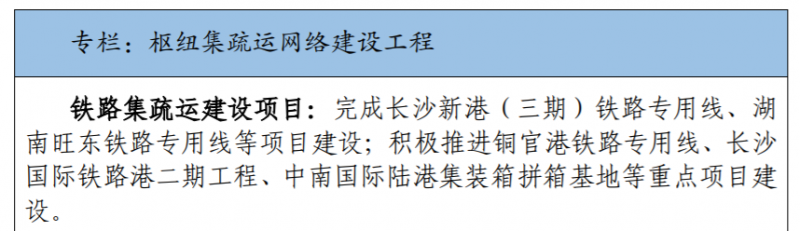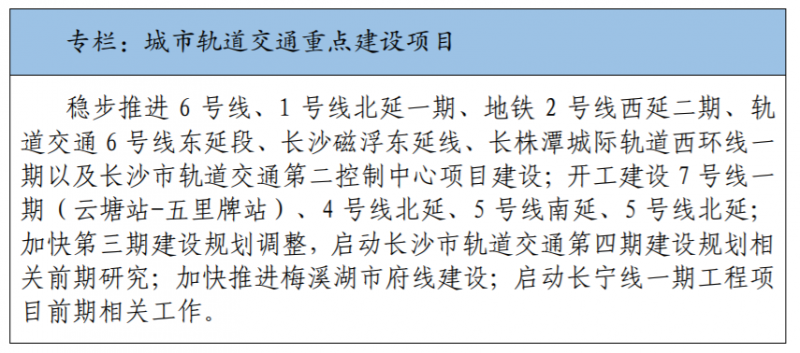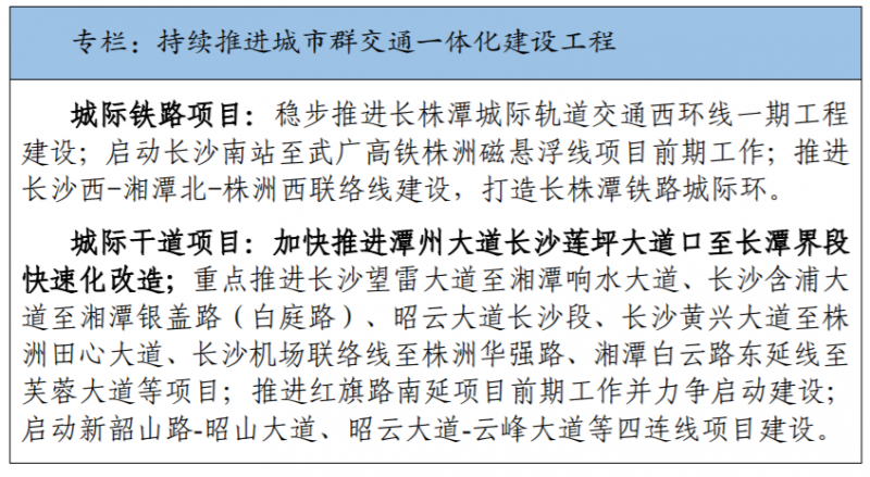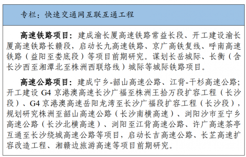 “十四五”期,重点推进渝长厦高速铁路常益长段、渝长厦高速铁路长赣段等高速铁路建设项目,建设里程约153公里,总投资约305亿元;重点推进宁乡-韶山高速公路、江背-干杉高速公路、G4京港澳高速长沙广福至株洲王拾万段扩容工程(长沙段)、G4京港澳高速岳阳龙湾至长沙广福段扩容工程(长沙段)等项目建设,总投资约187亿元。