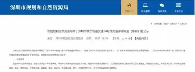 深圳市规划和自然资源局依职责组织编制了《深圳市城市轨道交通24号线交通详细规划》,依据《中华人民共和国城乡规划法》、《广东省城市控制性详细规划管理条例》、《深圳市城市规划条例》和《深圳市轨道交通项目建设管理规定》等相关规定,现就本规划相关事项公示如下: