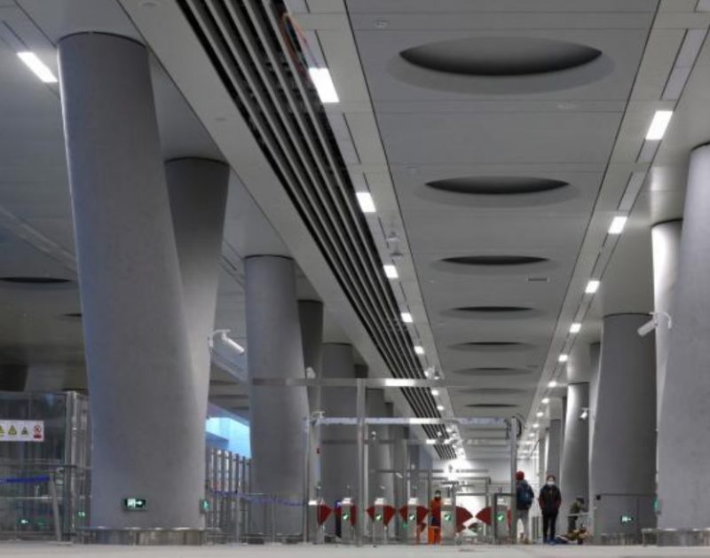 14号线剩余段工程的主要工程量集中在丽泽商务区站。该站位于丽泽商务区核心位置,是整个核心地区的主要交通枢纽,与周边一体化设计,为公共空间的组成部分,具有高大空间体验。站厅站台采用中庭形式,空间灵动连通,换乘厅采用扩大站厅,在市政绿地范围设置采光天窗,结合地面景观引入自然阳光至站台空间,增加人的舒适体验,为整个区域提供丰富的附加增值。