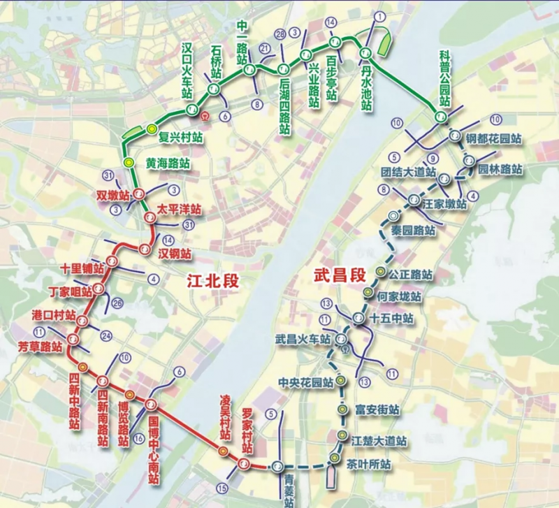 武汉地铁12号线是武汉市轨道交通“环+放射”线网规划中唯一环线,全长59.9公里,连通武汉三镇,串联硚口、江汉、江岸、青山、洪山、武昌及汉阳7个行政区域,共设站37座。经由武昌火车站和汉口火车站两大交通枢纽,并与18条地铁线路实现换乘,换乘站数量达26座,是当之无愧的“换乘之王”。