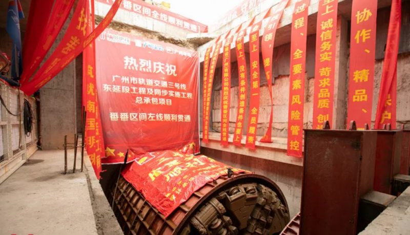 12月17日,在建地铁三号线东延段顺利完成重大工程节点:继今年9月“盾建3-1”盾构机顺利完成掘进任务后,“盾建3-2号”盾构机也破土而出,标志着番禺广场至番禺客运站区间(以下简称“番番区间”)左线隧道顺利贯通,这也标志着番番区间隧道实现双线贯通,成为三号线东延段首个双线隧道贯通的区间。