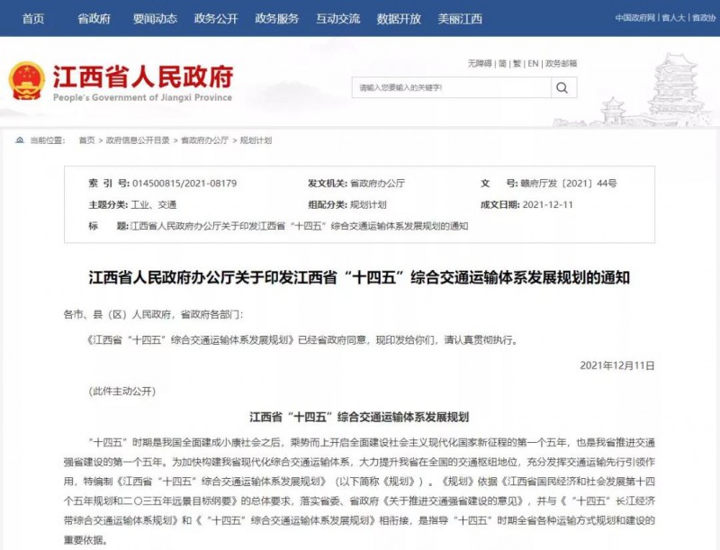 《江西省“十四五”综合交通运输体系发展规划》(以下简称《规划》)日前印发。“十四五”时期是我省推进交通强省建设的第一个五年,《规划》是指导“十四五”时期全省各种运输方式规划和建设的重要依据。