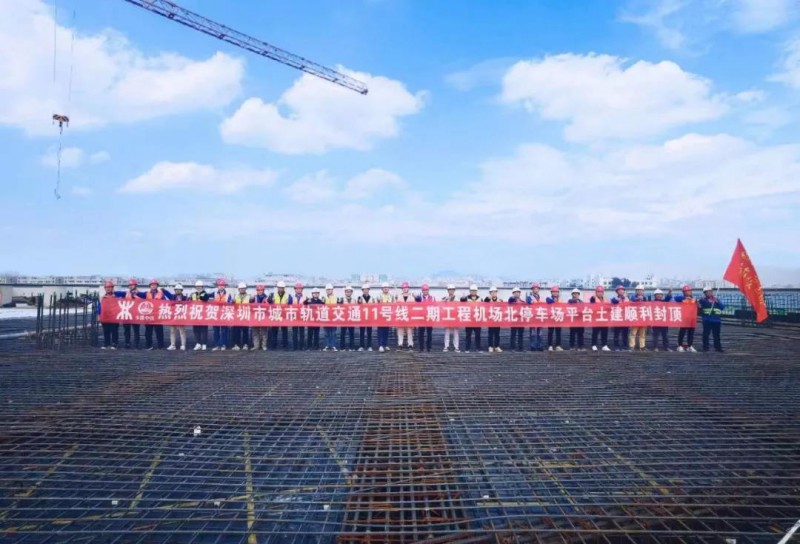 12月24日上午10时,随着最后一块顶板混凝土浇筑,深圳地铁11号线二期工程机场北停车场工区主体结构顺利封顶。
