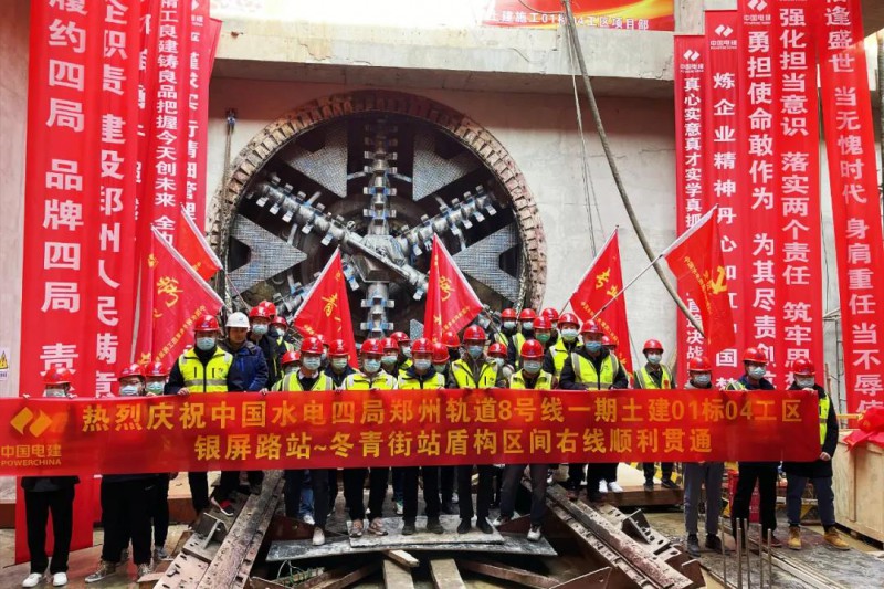 水电四局承建的04工区包括郑州大学站、银屏路站、郑州大学站~银屏路站、银屏路站~冬青街站两站两区间。郑州大学站为地下三层岛式车站,车站主体结构长为257.0米。银屏路站为地下两层岛式车站,站内设置双停车线,主体结构长约515.2米。两区间共采用4台盾构机在银屏路站双向始发,左线总长2387.327米,右线总长2363.097米。这是四局轨道建设首次进入郑州市场,吹响了四局郑州轨道建设的新号角。