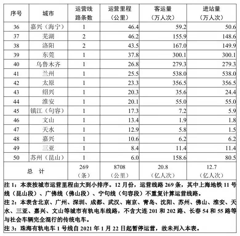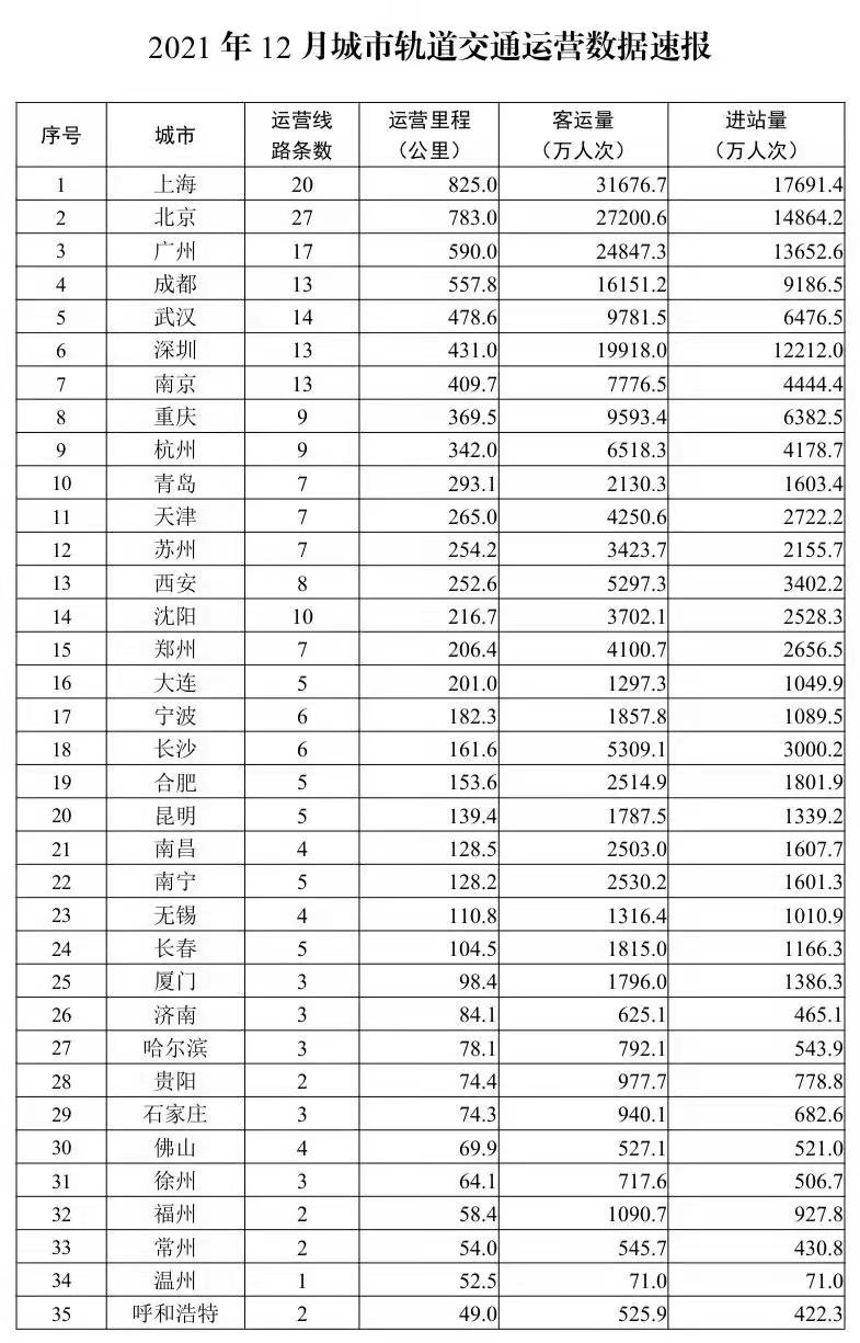 交通运输部今日发布了2021年12月城市轨道交通运营数据速报: