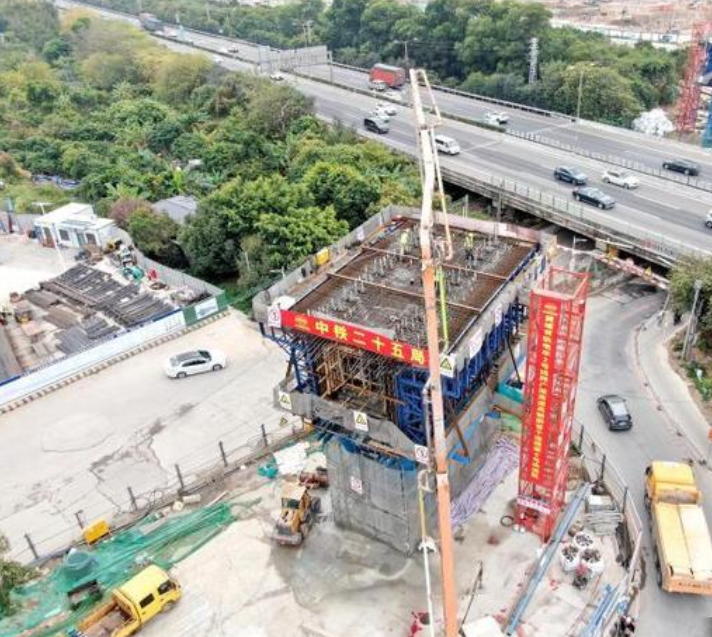 据中铁二十五局项目负责人周长磊介绍,此次浇筑的0号块位于跨广深高速高架桥段(60+93+53)米连续梁YP05号主墩,采用挂篮悬浇方式施工,混凝土浇筑方量达214立方米。该连续梁跨越的“中国最繁忙高速公路”——广深高速,日均车流量65万,被誉为粤港澳大湾区内的“黄金走廊”,连续梁施工安全风险极高。