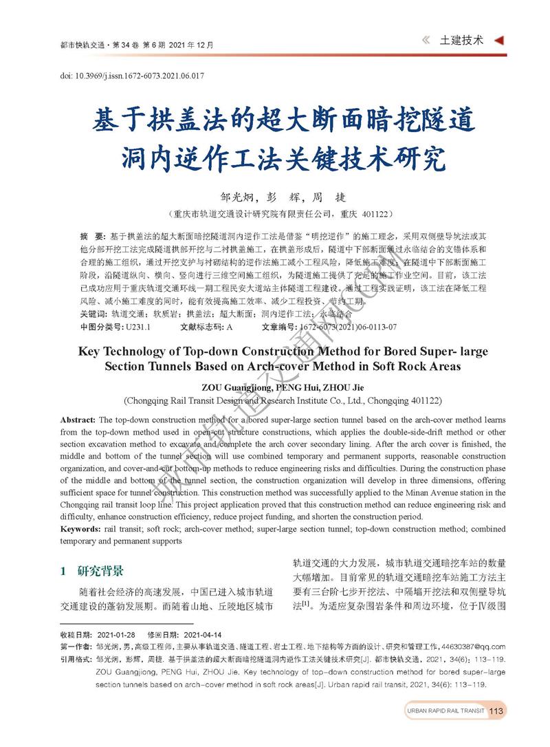 基于拱盖法的超大断面暗挖隧道洞内逆作工法关键技术研究