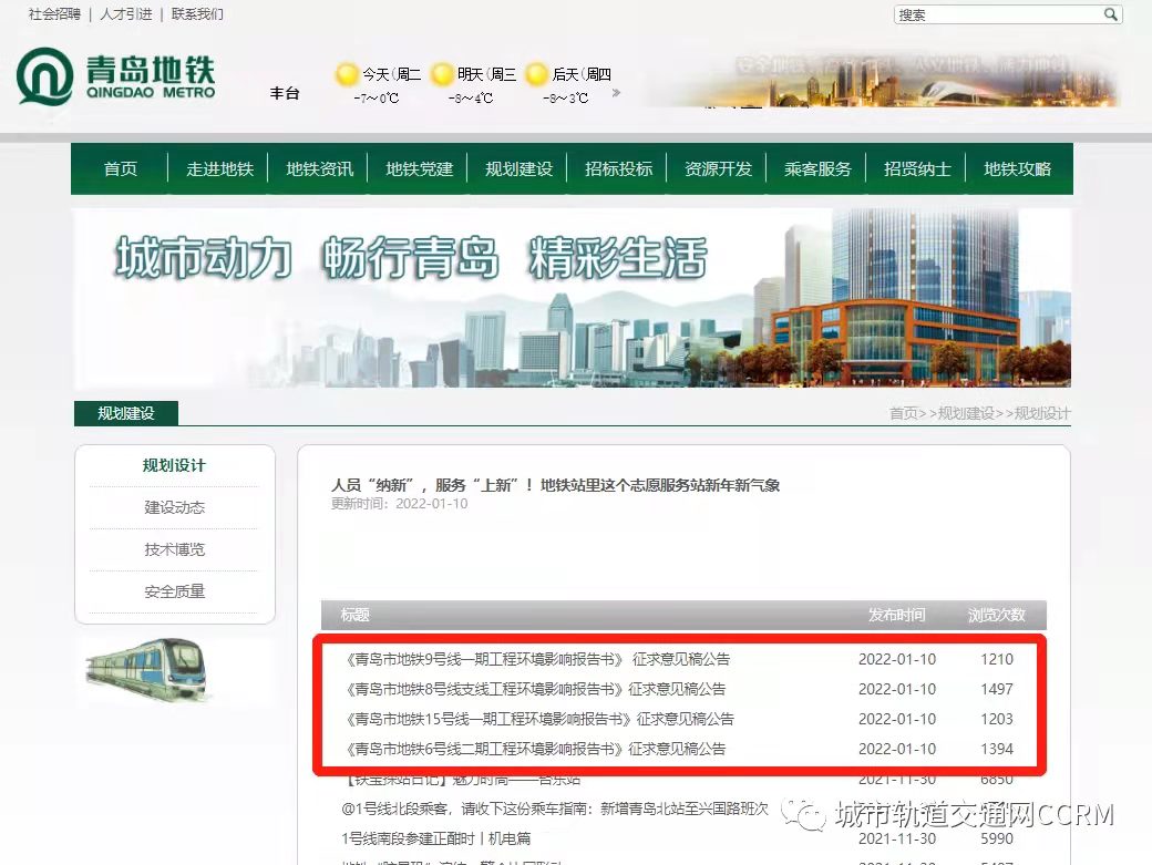1月10日,青岛地铁官网发布6号线二期工程、9号线一期工程、15号线一期工程、8号线支线工程《环境影响报告书》征求意见稿公告。