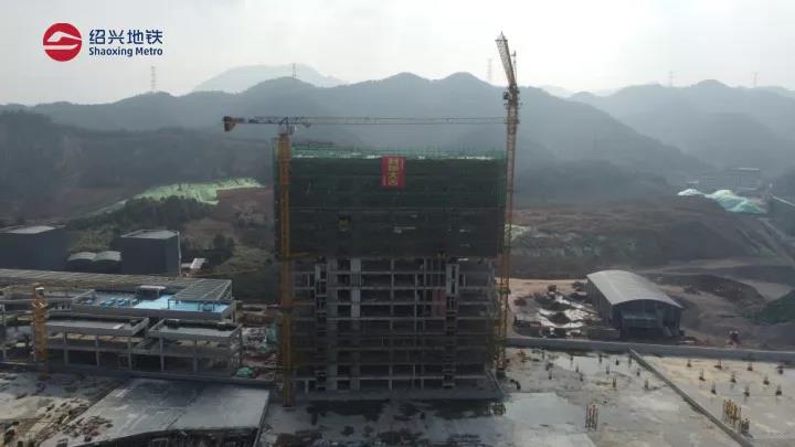 综合楼位于鉴湖停车场咽喉区南侧,芳泉站西侧,总建筑面积为31378平方米。主楼高79.14米,包括地下1层和地上17层,裙楼高约29米,裙楼盖板以下为轨道交通芳泉站站后折返线。该楼自2021年3月开工以来,在施工现场场地局促、与芳泉站和鉴湖停车场上盖交叉施工、物料运输难度大等情况下,有序统筹,科学施工,加强超高超大跨度支架搭设等关键工序组织,确保了安全质量并按既定目标顺利封顶。