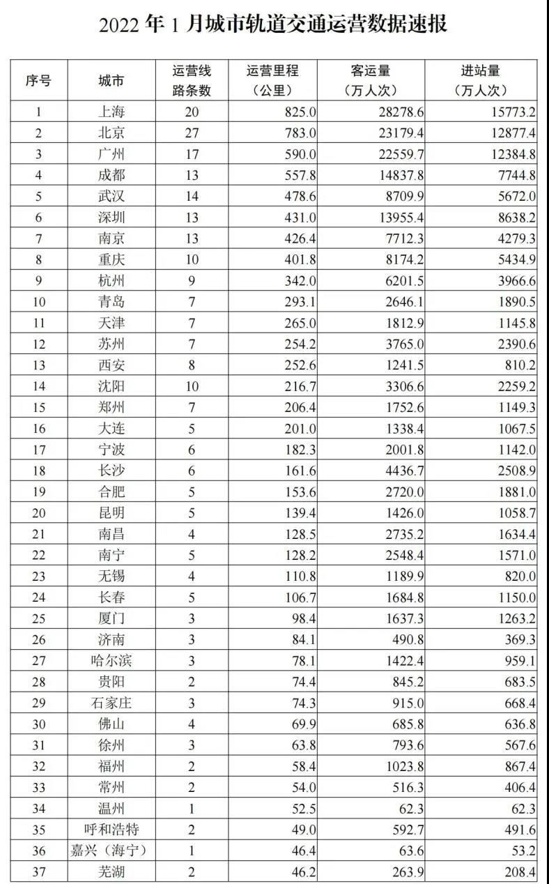 1月份,新增运营线路1条、运营里程32.3公里,为重庆市轨道交通9号线一期。1月份,51个城市完成客运量环比减少2.8亿人次、下降13.5%,同比去年1月增加0.3亿人次、增长1.7%。