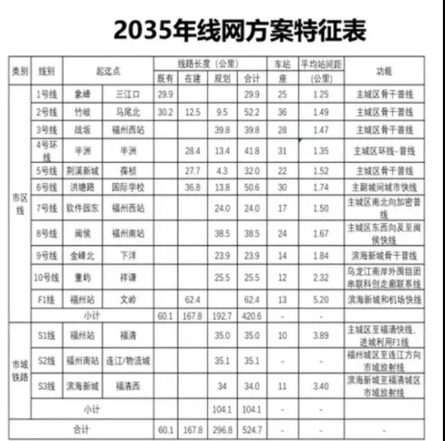 随推文附带的还有一份“福州市轨道交通2035年规划推荐方案示意图”以及“2035年线网方案特征表”。内容显示,至2035年,福州将规划建设建成市区线11条(地铁1-10号线、F1线),市域铁路3条(S1-S3线)。共计14条线路总长度524.7公里。