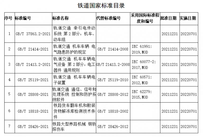 近日,由国家铁路局组织编制的《轨道交通 牵引电传动系统 第2部分:机车、动车组》等7项铁道国家标准,经国家标准化管理委员会审批后正式发布。7项标准中新制定1项,修订6项,将于2022年7月1日实施。该7项标准是中国铁路技术标准体系的重要组成部分,其发布为铁路产品的设计、制造、检验等提供了技术依据,对保障铁路运营安全和提高产品质量将起到积极的作用。