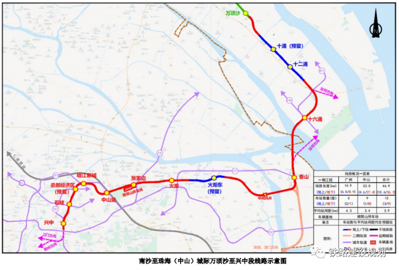 《公示》进一步披露了项目相关信息。南沙至珠海(中山)城际万顷沙至兴中段新建线路正线全长47.6公里,其中高架段4.6公里、路基段0.15公里,地下段42.85公里。线路设计时速160公里。