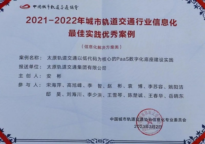 会上,太原轨道集团报送的“太原轨道交通以低代码为核心的PaaS数字化底座建设实践”案例,荣获2021-2022年城市轨道交通行业信息化最佳实践优秀案例奖。