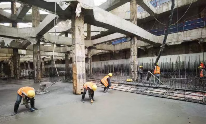 由中国铁建南京南部新城二分部负责施工的地铁10号线二期工程包含一站两区间。其中,大校场站为5号线、10号线二期两线换乘站,位于大校场老机场主跑道北侧绿化带内,沿机场跑道方向敷设,与5号线L型换乘。车站为地下二层岛式车站,站台宽度13米,标准段宽度22.1米,底板埋深17.3米,车站总长581.4米。车站均为明挖施工。整个车站划分为25个流水段施工,自2022年8月27日第一流水段底板施工开始,项目部科学制定施工方案,严格安全管控措施,克服环保、交叉施工等因素影响,历时7个月,完成了全部流水段底板施工,保证了整个基坑的安全稳定。目前,大校场站除底板全部施工完成外,负二层侧墙和中板已开始同步跟进流水施工。