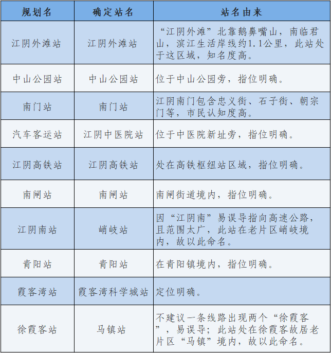 近日,根据江阴市交通局《关于锡澄轨道S1线站名命名的通知》,锡澄S1线站点命名正式确定。由北向南分别是:江阴外滩站、中山公园站、南门站、江阴中医院站、江阴高铁站、南闸站、峭岐站、青阳站。