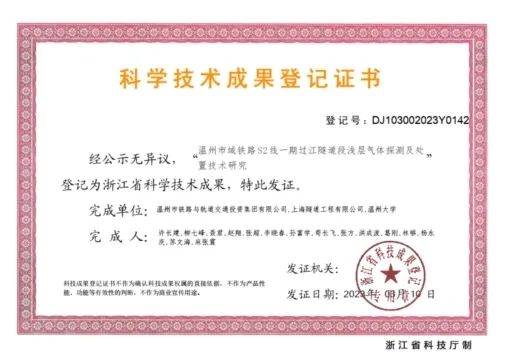 近日,市铁投集团牵头的“温州市域铁路S2线一期工程过江隧道段浅层气体探测及处置技术研究”项目获得浙江省科学技术成果认定。
