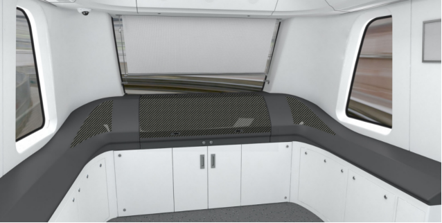 内装整体简洁、通透,采用全车通常灯带,立柱上方增加小环形灯带,动感时尚;采用操作台、边柜和逃生门罩板一体化结构,整体性增强,美观效果提升。