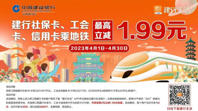 为了更好地便民惠民,建行生活APP及中国建设银行APP还配套上线了乘坐南昌地铁最高立减1.99元优惠活动(如下图),真正为百姓的生活注入数字金融活力。南昌地铁是作为继全省公交、全省长途客运汽车之后,中国建设银行江西省分行在建行生活APP及中国建设银行APP上接入的又一个公共交通行业项目,对于丰富居民出行场景,完善城市生活服务体系有着显著作用。