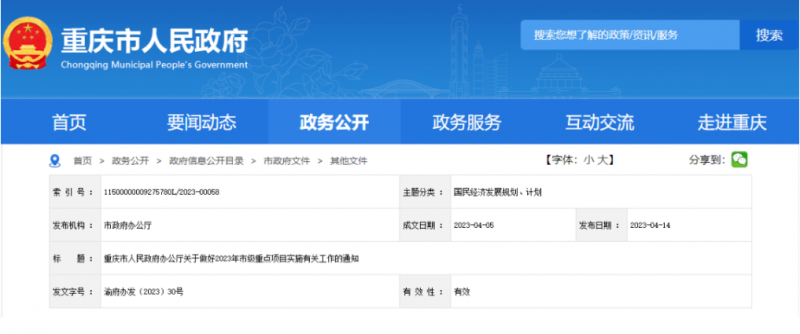 近日,重庆市政府办公厅印发《关于做好2023年市级重点项目实施有关工作的通知》,正式公布2023年重庆市市级重点项目名单。名单包含重点建设项目1156个,总投资超3万亿元,年度计划投资约4300亿元。